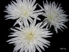На столе три белых хризантемы.