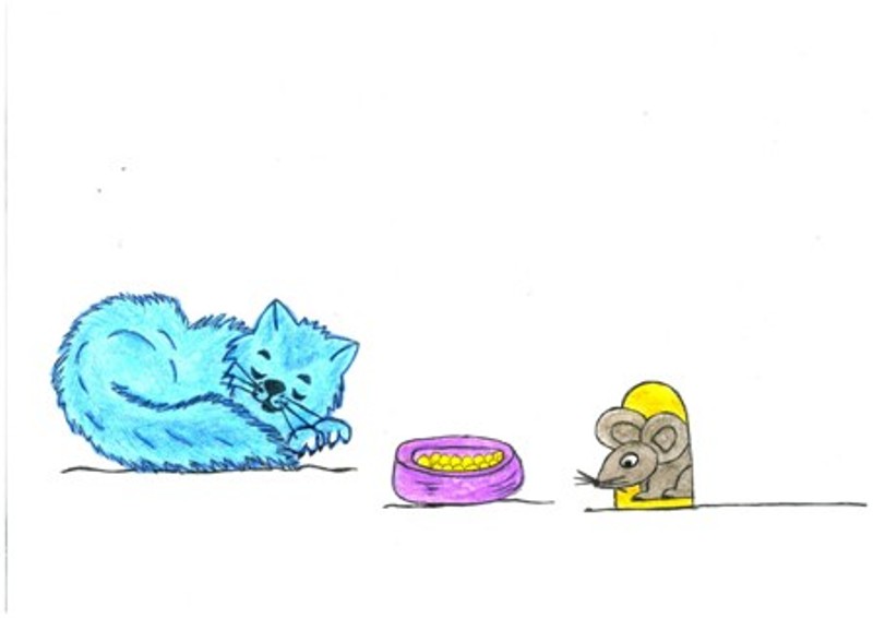 В большом просторном доме живёт Васька. Это красивый, пушистый кот голубого цвета, только на передних лапках у него белые пятнышки. Хозяйка его очень любит. Когда она приходит с работы, он встречает её в коридоре, начинает сразу ластиться к ней. Потом весь вечер ходит за ней по пятам, куда она туда и он. Сядет в кресло, Васька прыг к ней на руки, гладь его по спинке, чащи за ушком, а он лежит довольный, мурлычет сам себе: мур - мур - мур. Однажды, когда хозяйка ушла утром на работу, Васька услышал какой - то странный шорох на кухне, навострив уши стал пробираться на кухню, чтобы посмотреть, что там происходит. Какой ужас, он не поверил своим глазам, когда увидел, как мышонок ест из его любимой миски китекет. Вот это наглость, подумал Васька, шерсть дыбом мигом поднялась, изогнулся весь дугой, хвост распушил, это так он выразил своё недовольство. И готов был в ярости, схватить мышонка. Тот испугался, задрожал от страха, виновато смотрит на его и думает про себя, ой какой большой лохматый кот, какой страшный и опасный, съест меня и глазом не моргнёт. Вдруг в дверь дома кто - то постучался и Васька в этот момент обернулся назад. Это спасло мышонку жизнь. Он шустро убежал в свою норку.