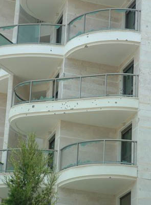 Где-то около часа дня я услышал непонятный свист. Не успев даже подумать об этом, я уже понимал где-то глубоко внутри себя, что это начался обстрел. Первый ракетный снаряд упал довольно далеко от нашего отеля. Но второй несся прямо в нас, и мне казалось, что я вижу эту точку, потому что она пронеслась мимо нашей гостиницы и попала в жилой дом, находящийся приблизительно в 300 метрах от гостиницы. Снаряд попал в верхнюю квартиру пятиэтажного дома, вызвав значительное разрушение. Взрывной волной повыбивало стекла в окнах и на стеклянных балконах в соседних домах.